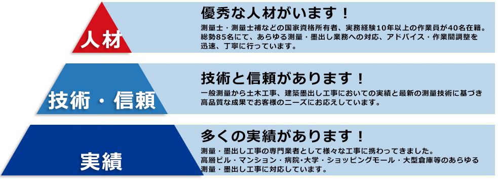 中村技建は、測量・墨出し工事の専門業者として、高層ビル・マンション・病院・大学・ショッピングモール・大型倉庫等のあらゆる工事に携わり、数々の実績を残して参りました。国家資格所有者や実務経験10年以上の作業員40名を含む総勢85名の優秀な人材のスキルを財産とし、最新の測量技術に基づいた高品質な成果で、お客様のニーズにお応えしています。